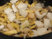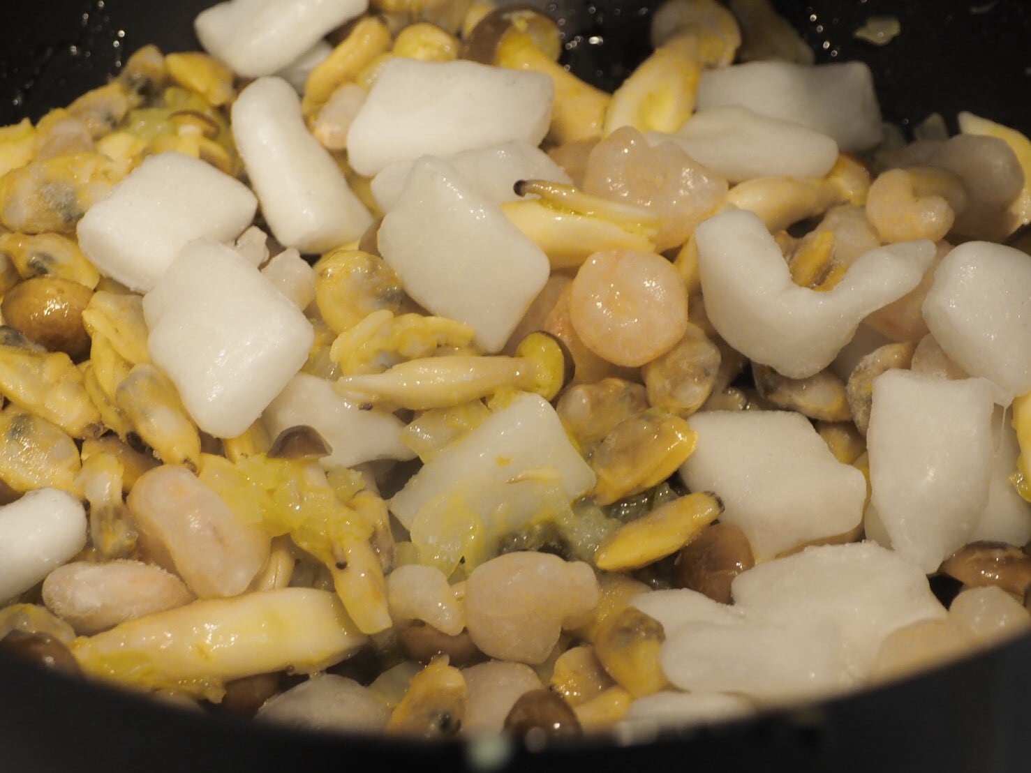 シーフードに火が通ったら弱火にしてスパイスを入れる